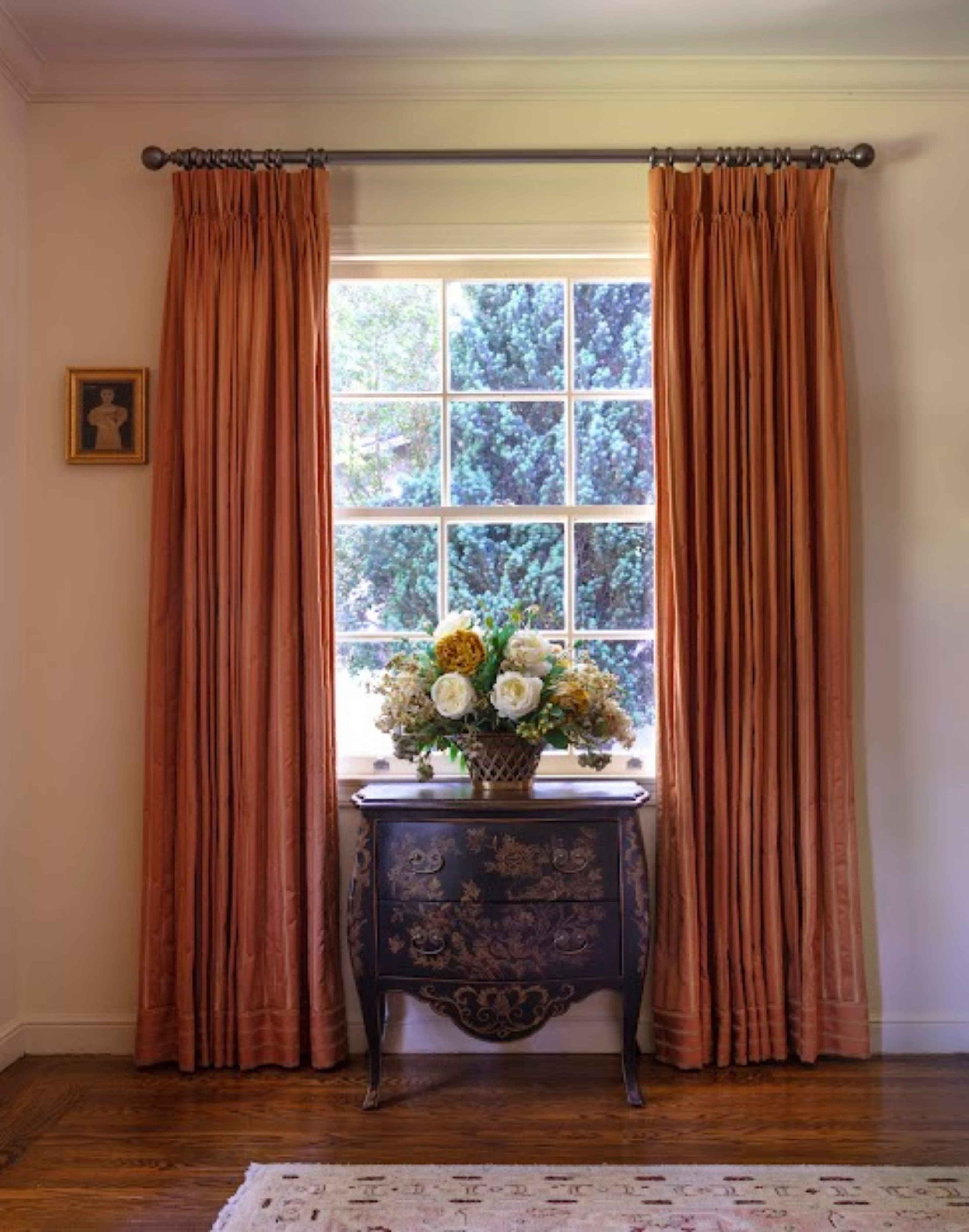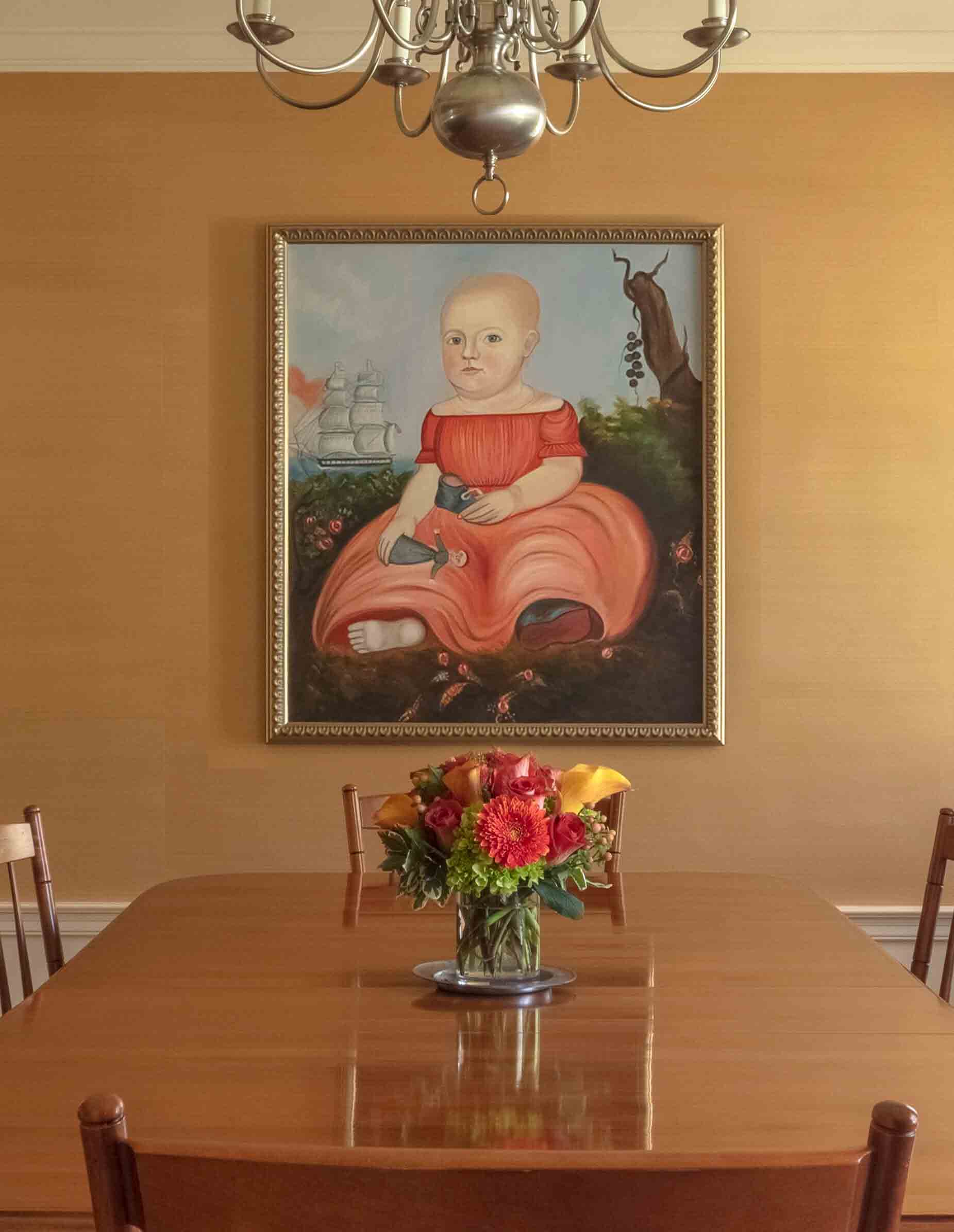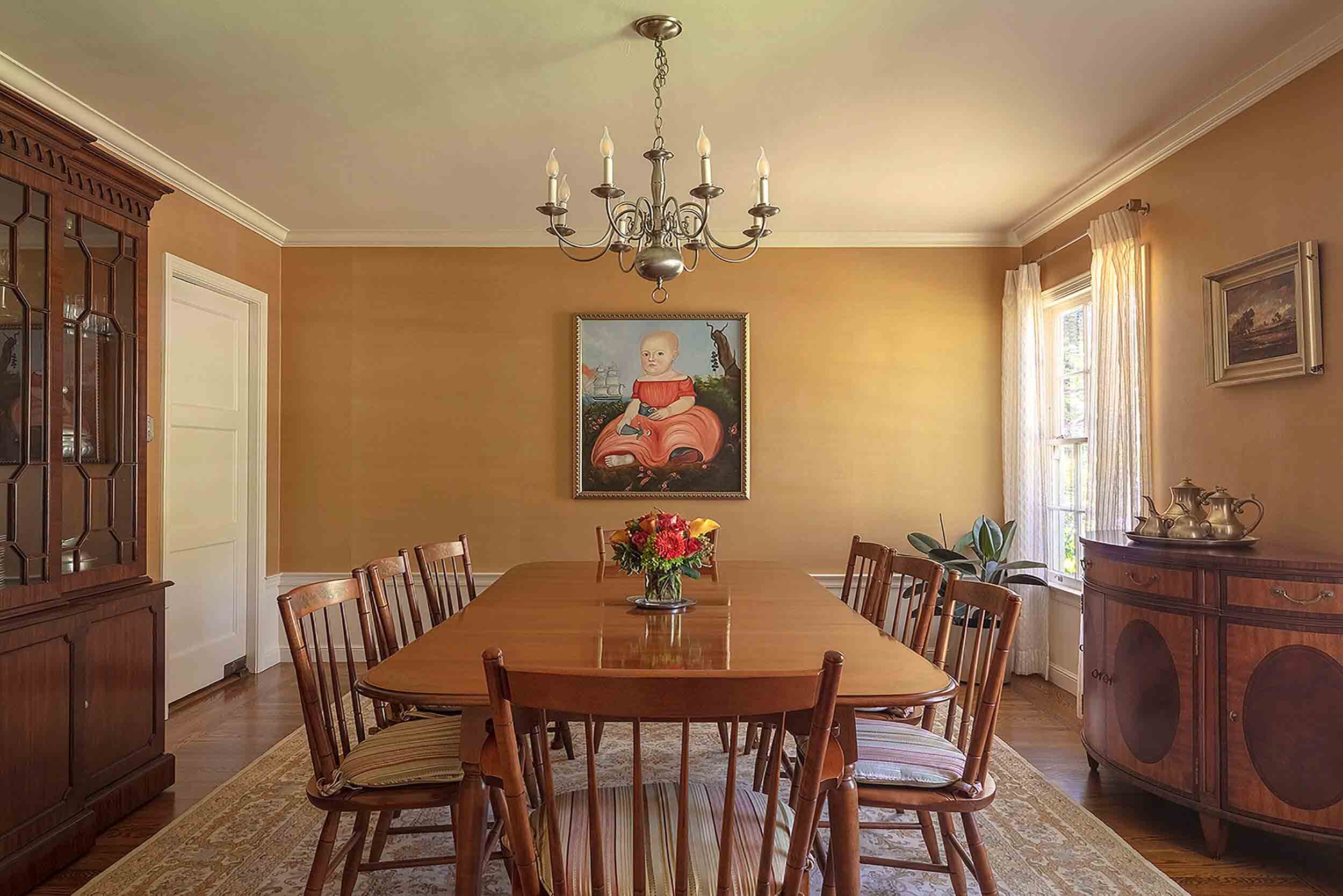 The dining room luster is attained by the use of historic gold silk wall covering in that shimmers in the light. The dining set, sideboard and other antiques are family heirlooms. We mixed it up with over-the-top wavy coffee and tables with a nod to the Queen Anne style. We purchased antiques to fill in, a beautiful large carpet and original art for a stunning effect.