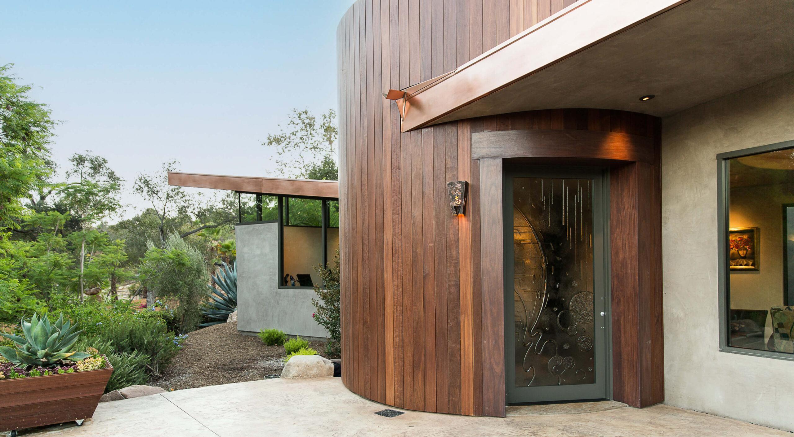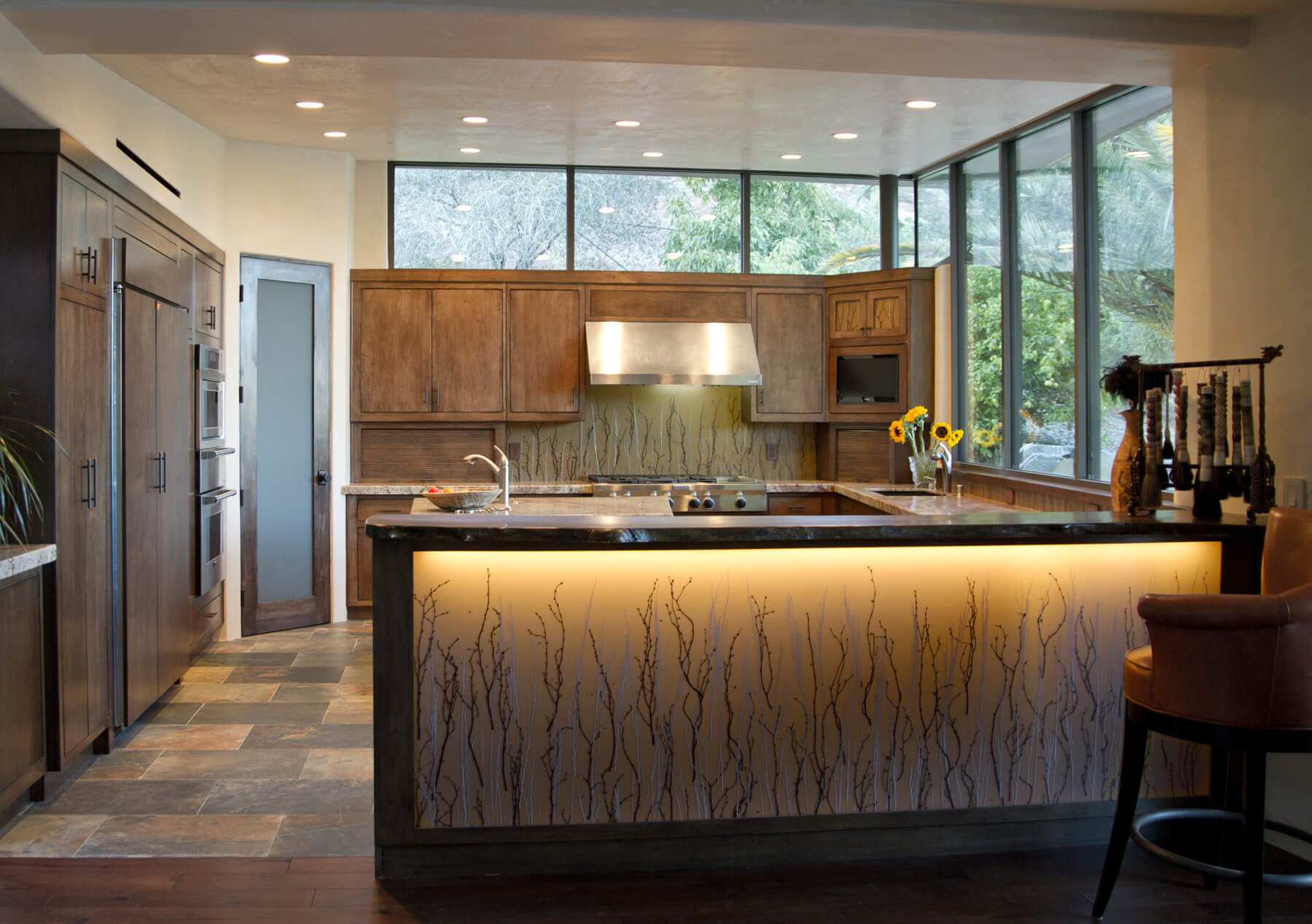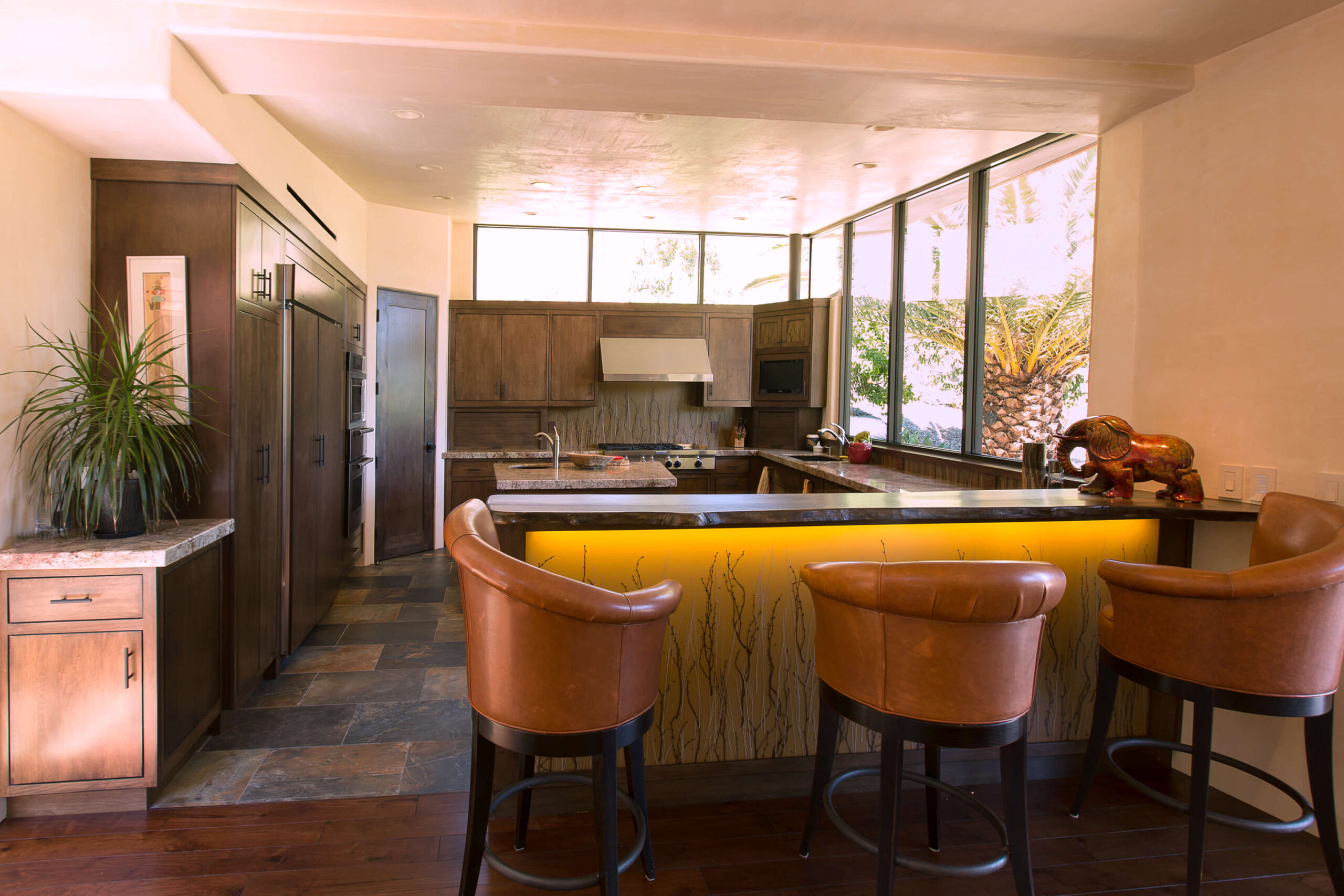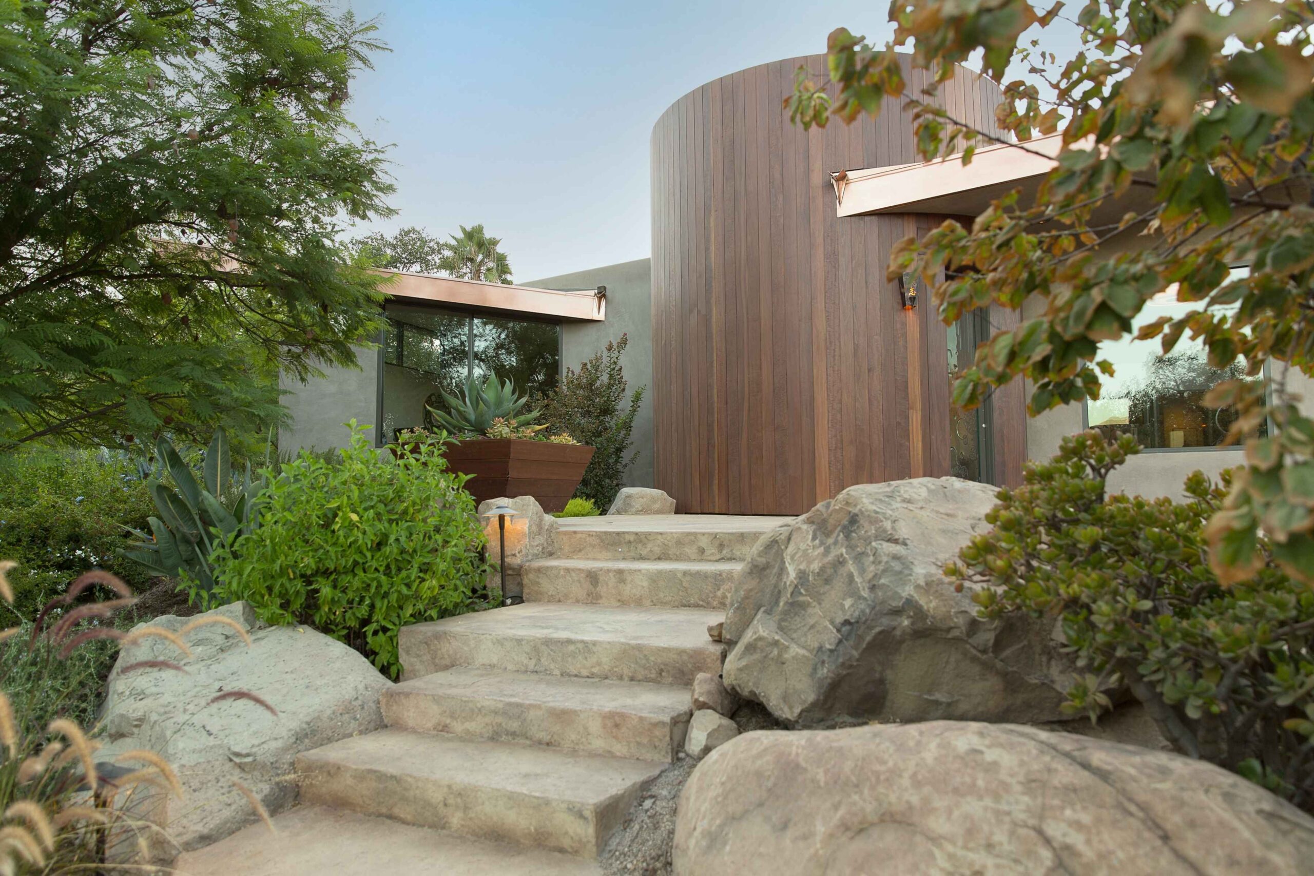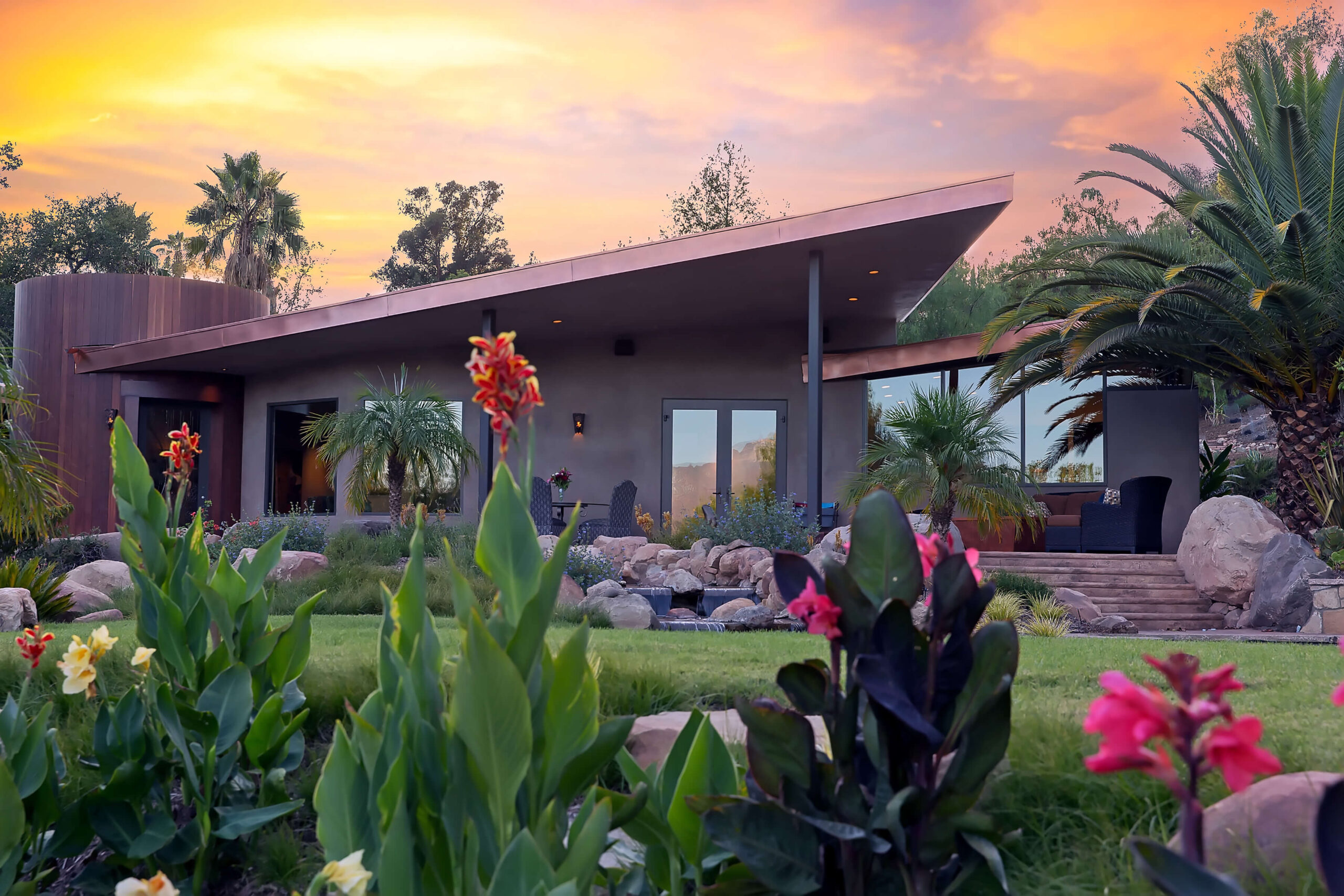 A once dilapidated bungalow on an impressive five acre lot was optimized with two soaring wings adding a new kitchen and office, along with the rotunda entry way, expanding the home to a single level impressive home. The pool, lounge area, landscape and outdoor design were designed to make a seamless indoor and outdoor experience.