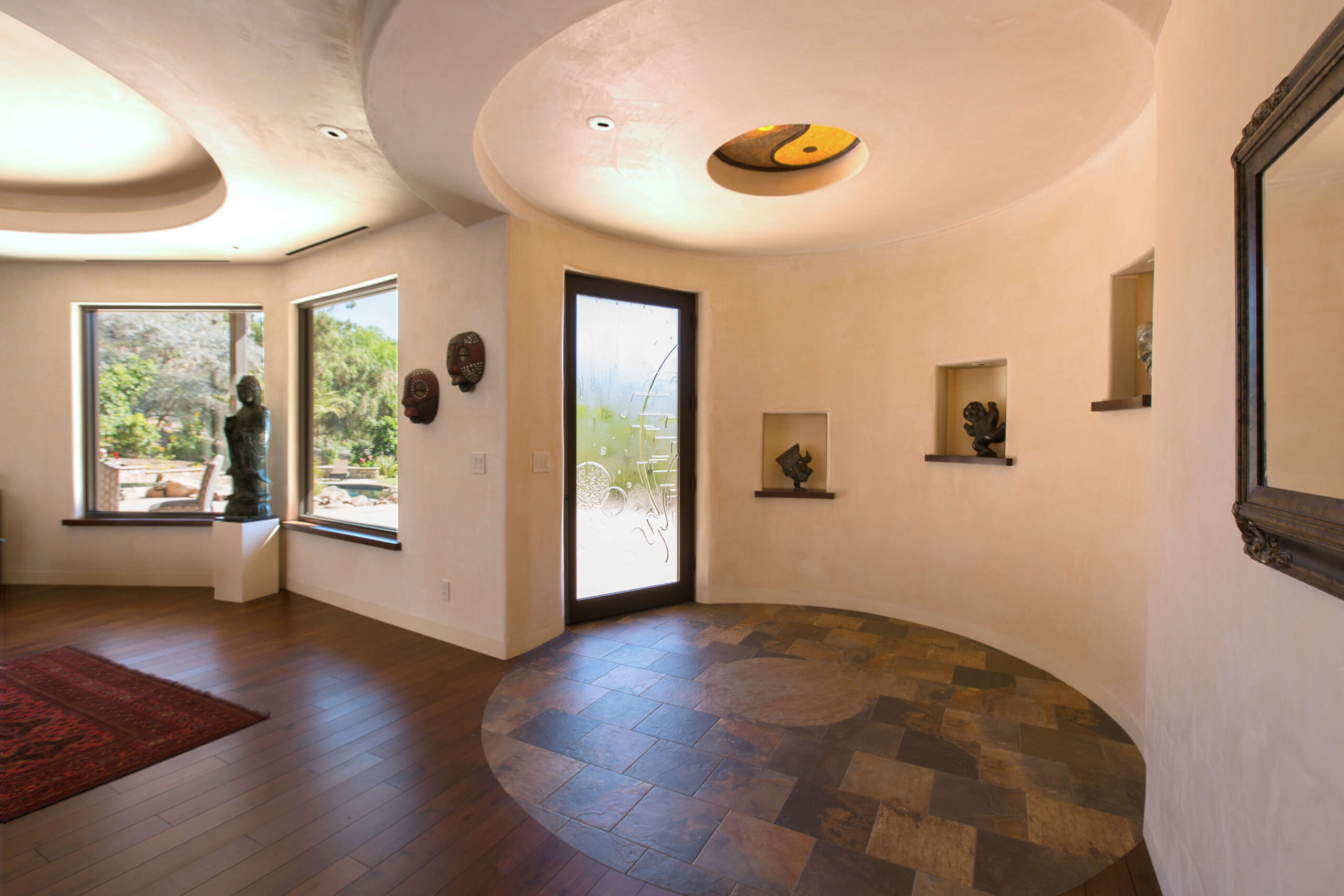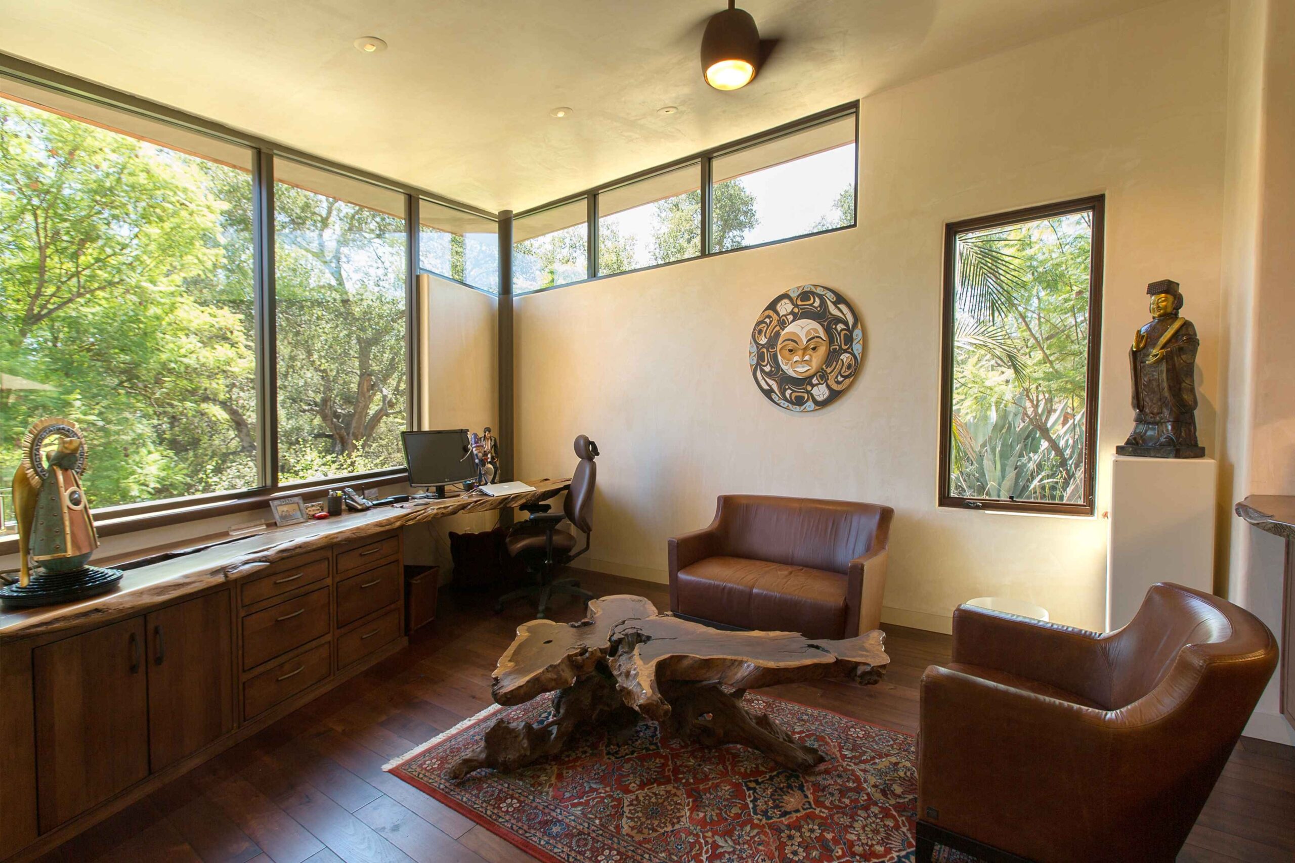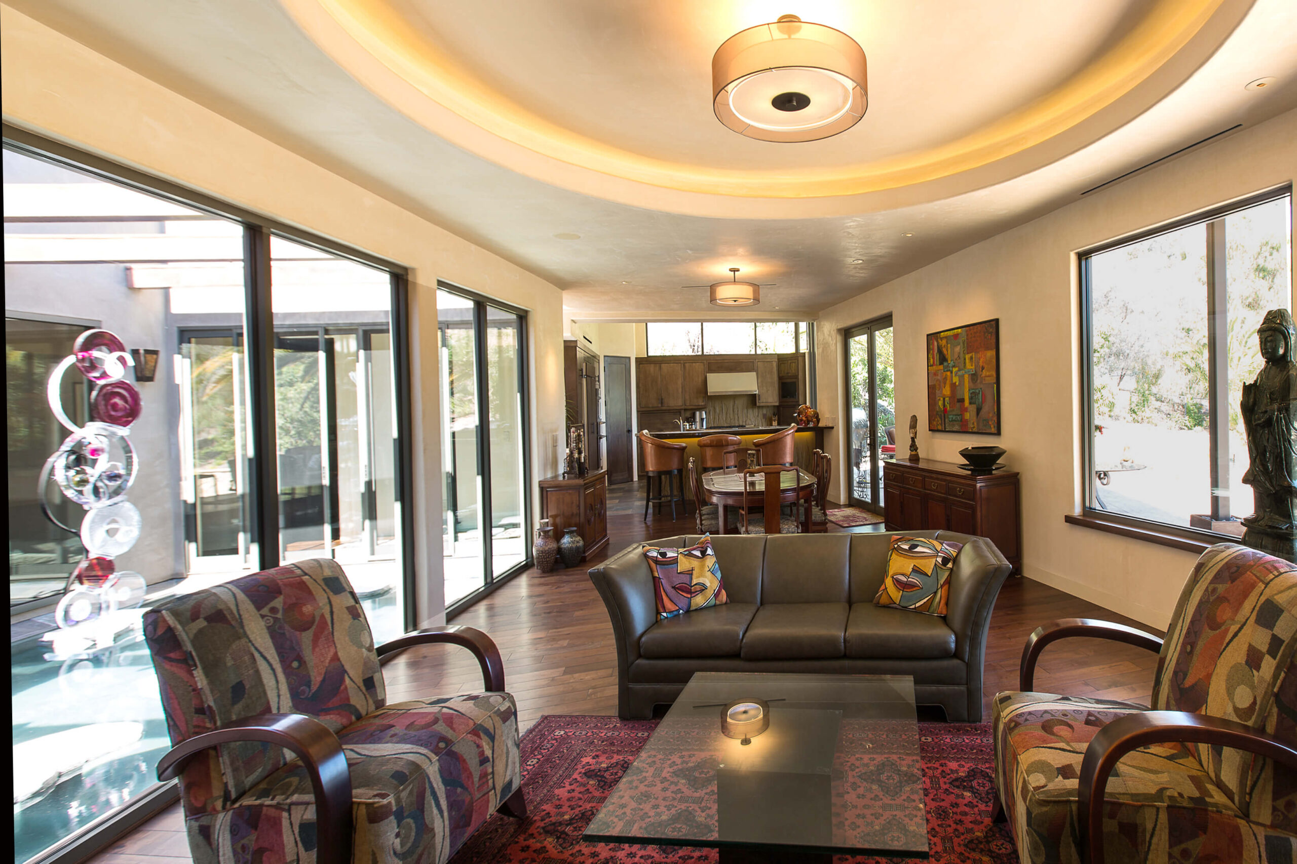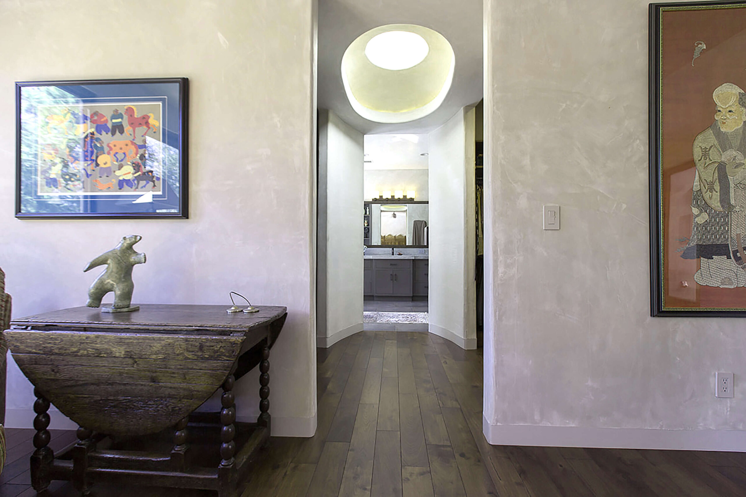 We created a heavenly space to showcase our client’s extensive Asian and Inuit art collection. We wanted to bring the outdoors in for a seamless experience in the temperate California environment. We added a waterfall and pond in the central courtyard, gutted and renovated the interior and added custom plaster walls. Utilizing vintage furnishings and pillows, along with Asian antiques.