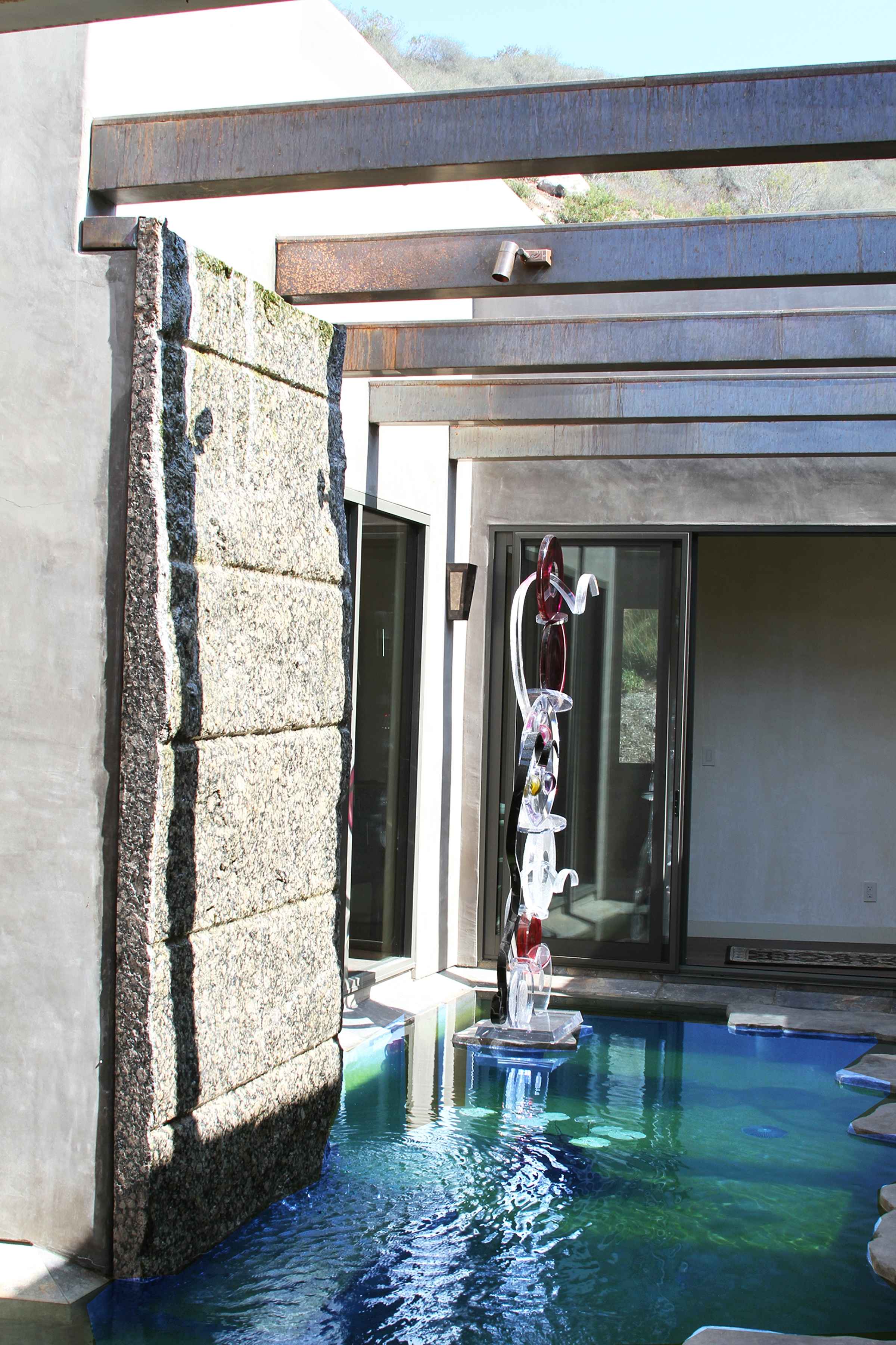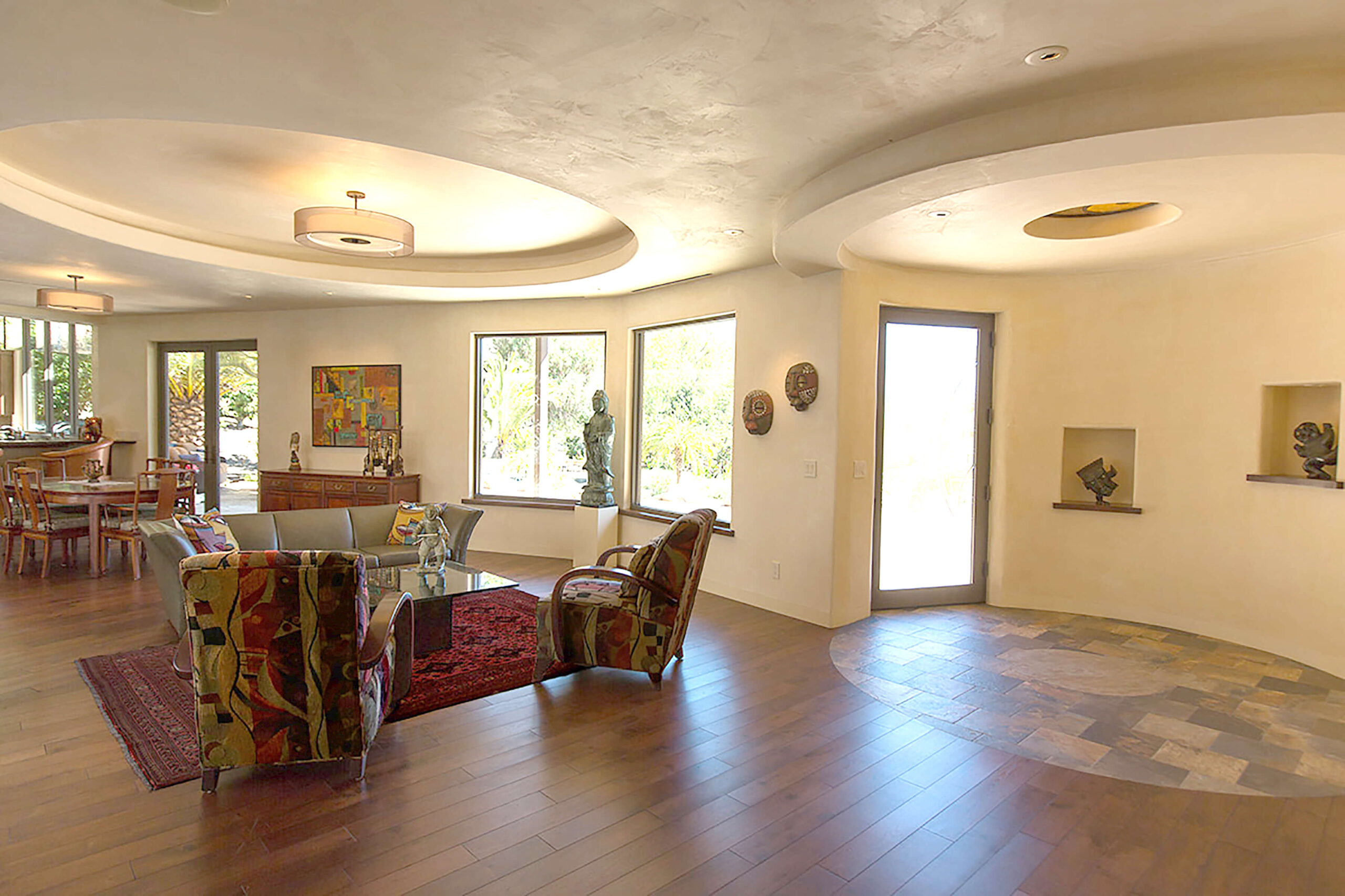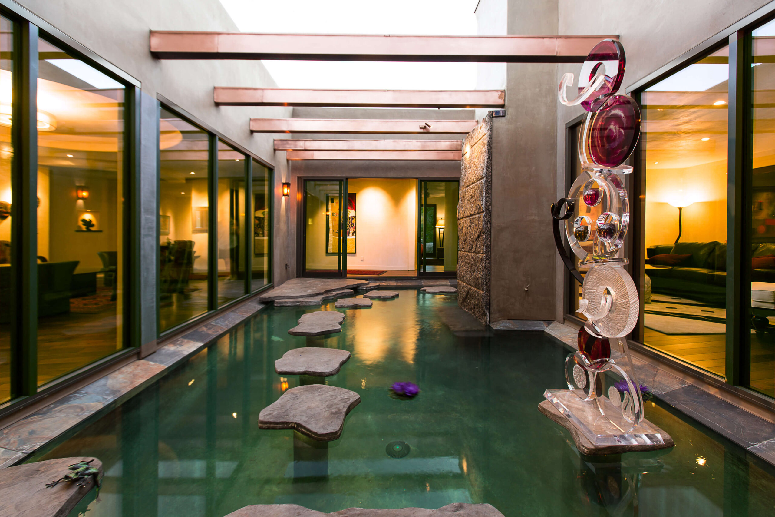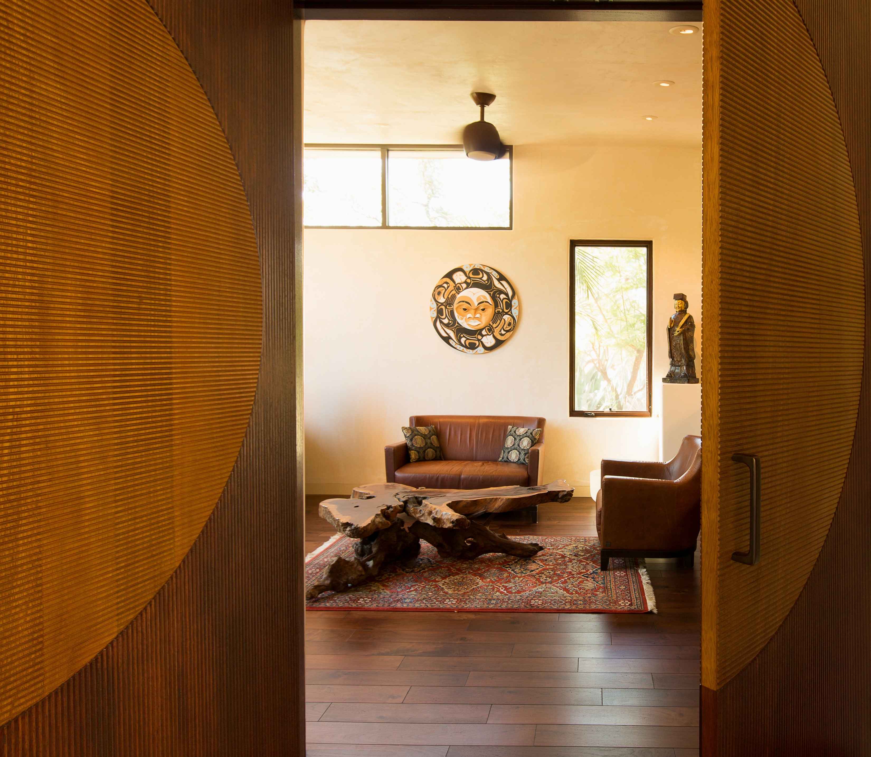 We created a heavenly space to showcase our client’s extensive Asian and Inuit art collection. We wanted to bring the outdoors in for a seamless experience in the temperate California environment. We added a waterfall and pond in the central courtyard, gutted and renovated the interior and added custom plaster walls. Utilizing vintage furnishings and pillows, along with Asian antiques.