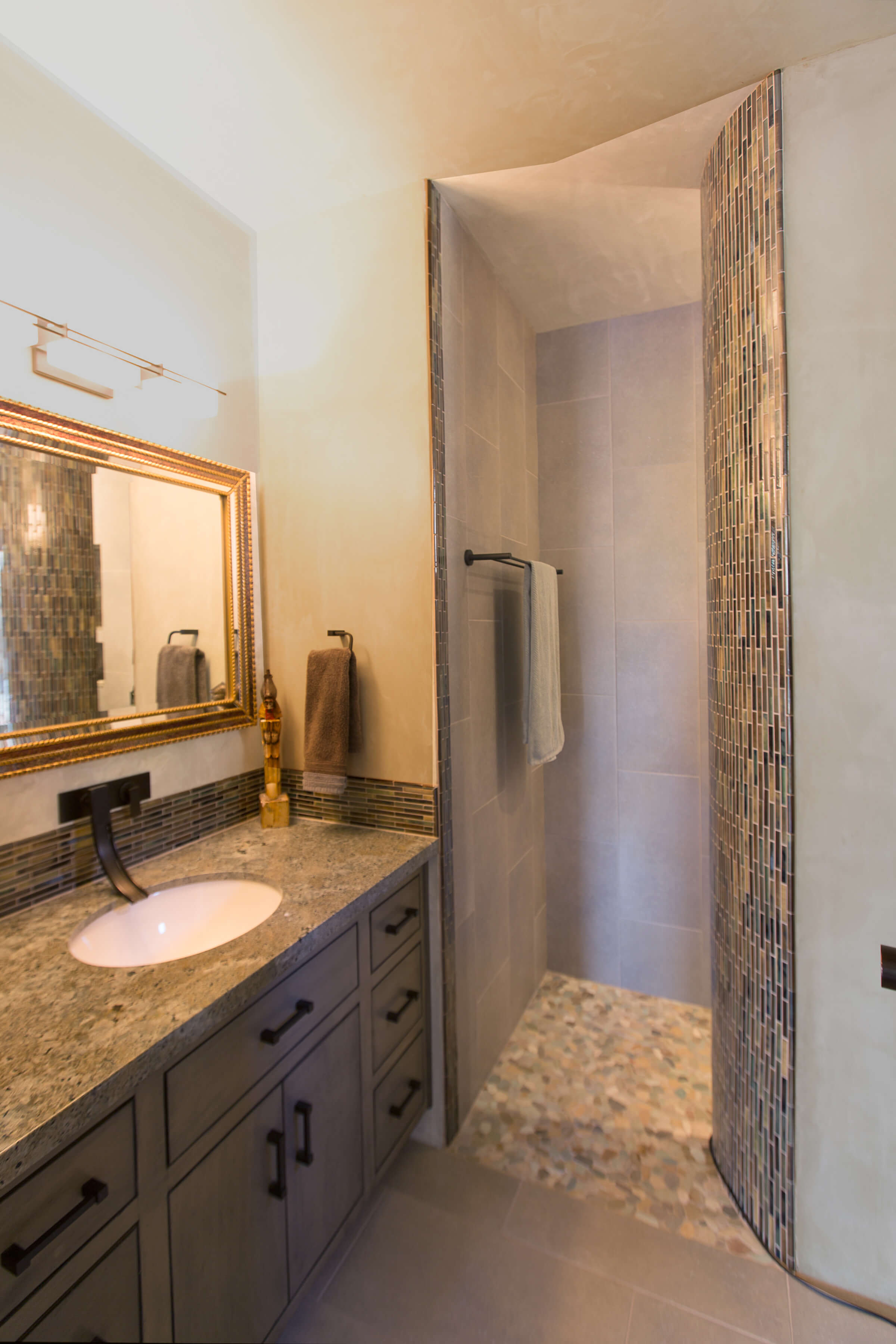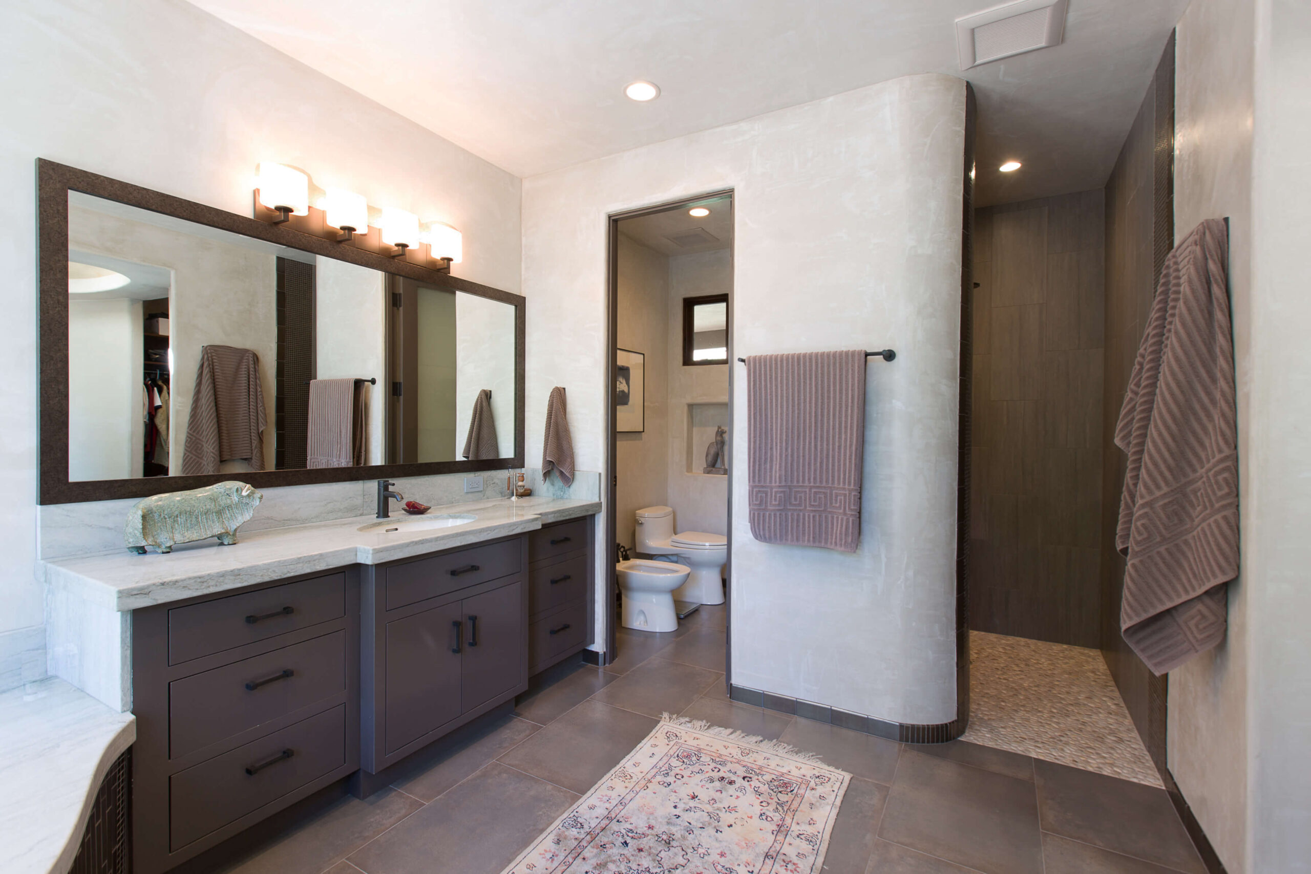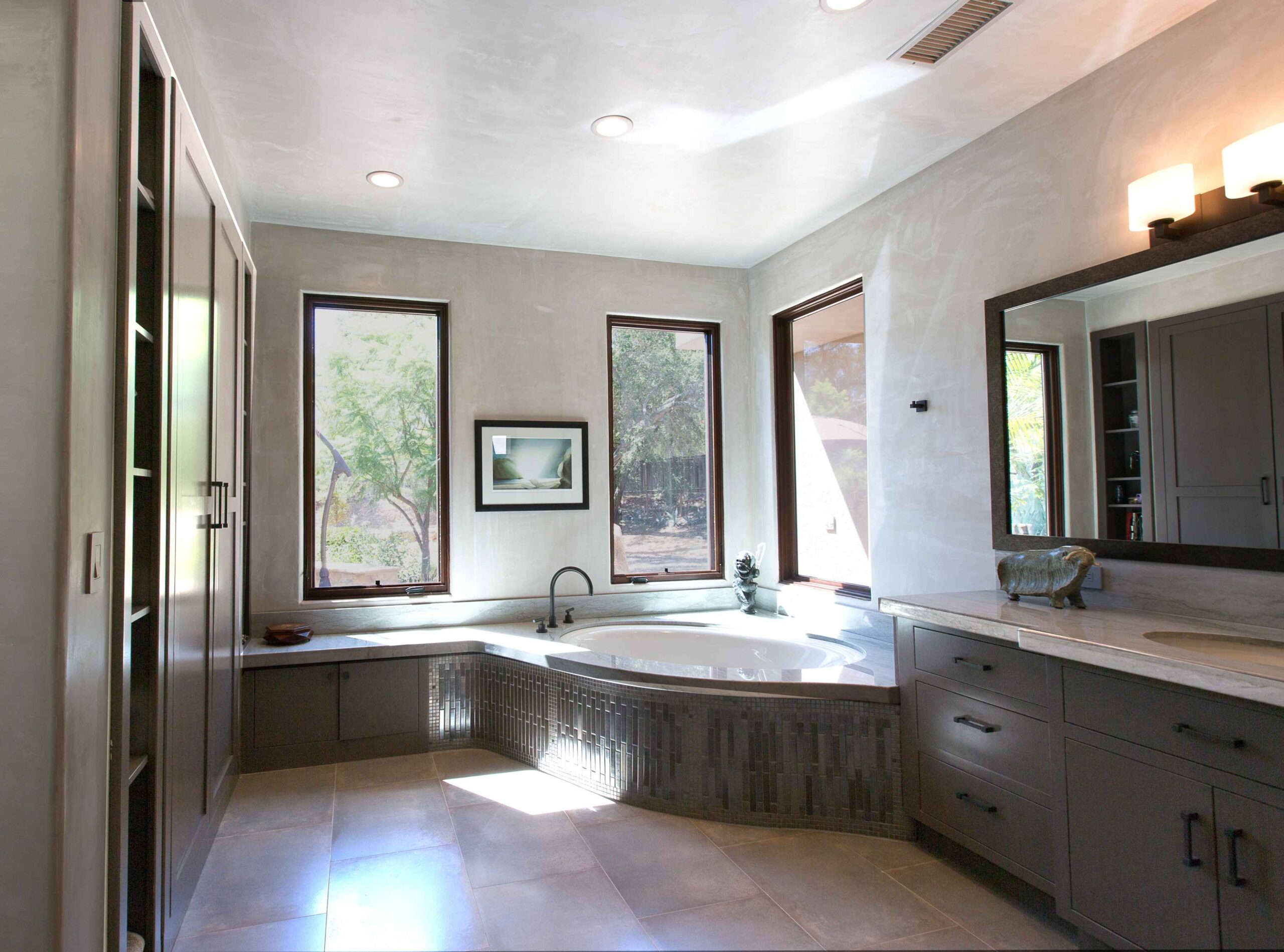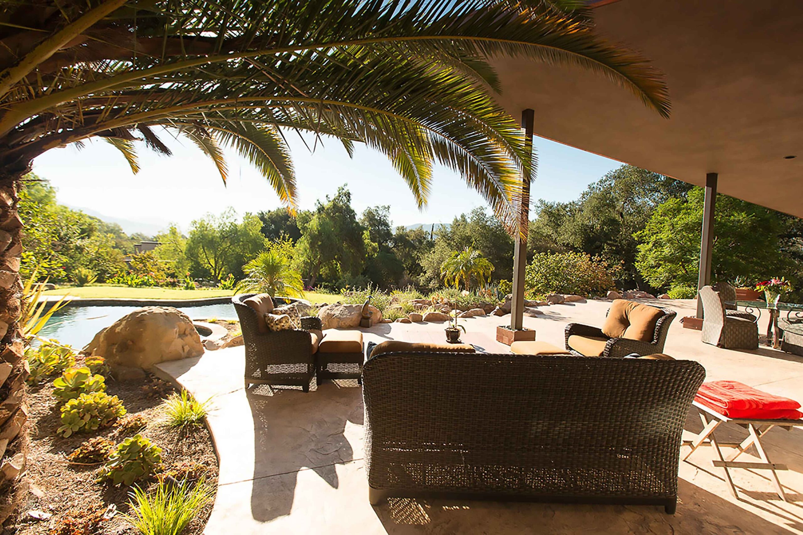 We created a heavenly space to showcase our client’s extensive Asian and Inuit art collection. We wanted to bring the outdoors in for a seamless experience in the temperate California environment. We added a waterfall and pond in the central courtyard, gutted and renovated the interior and added custom plaster walls. Utilizing vintage furnishings and pillows, along with Asian antiques.